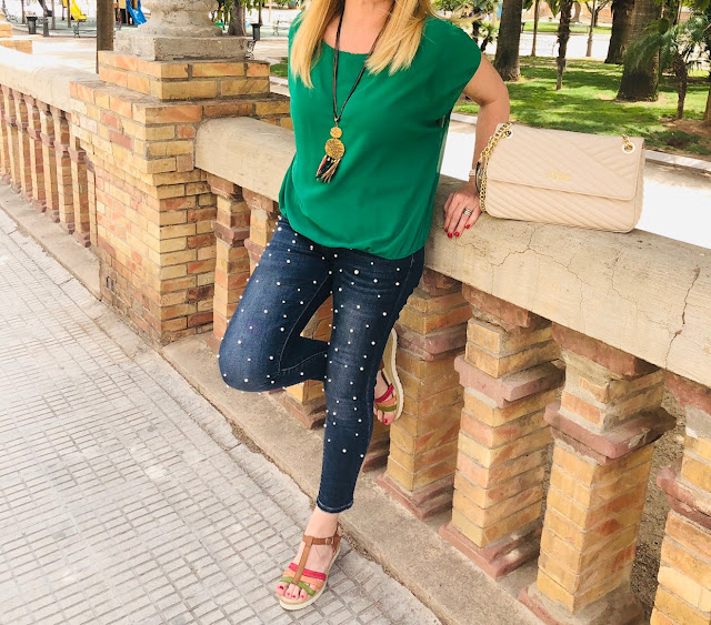 muy cómodas y me puse esta blusa verde de Mulaya con forma murciélago que combinaba perfectamente con ellas, y como no mis jeans de perlas que me vuelven loca y que son también de Mulaya ..Los